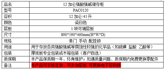 1.柜体采用抗强酸碱化学药品、耐冲击瓷白色PP板(原装进口)承制,具半******性,厚度8-12mm。??????????????????????????????????????? ???????????????????? 2.材料厚度:可根据客户要求选用8mm、10mm厚度板材。 ?3.配备进口聚丙烯防泄漏托盘,可单独取出,便于清洁,层板可根据需要调节。 ?4. 柜门开口贴有警示标贴,提醒周围人群注意安全,标签耐腐蚀性极高,使用年限长久。 ?5.为提高操作安全性,化学品柜还可以使用挂锁提供额外的防护。 ?6.柜门根据需要可定制为左开或右开形式,各种大小尺寸双开门或单开门式样均可订做。 ?7.可以用于各种腐蚀性化学品的存储,如硫酸,硝酸,乙酸,硫磺酸等,保护操作者及周围人群安全。 ?8.铰链把手均采用耐强酸、强碱的同质聚丙烯材料制作。 ?9.调整脚:采用塑钢模具成型,无金属部分外露,可依现场地面调整水平。 ?10. 聚丙烯防溢漏托盘盛放泄漏的化学液体,可移动便于清洁。 ?11.为提高操作安全度,化学品柜设计有使用挂锁孔,可加配挂锁。 ?12.使用寿命十年以上。